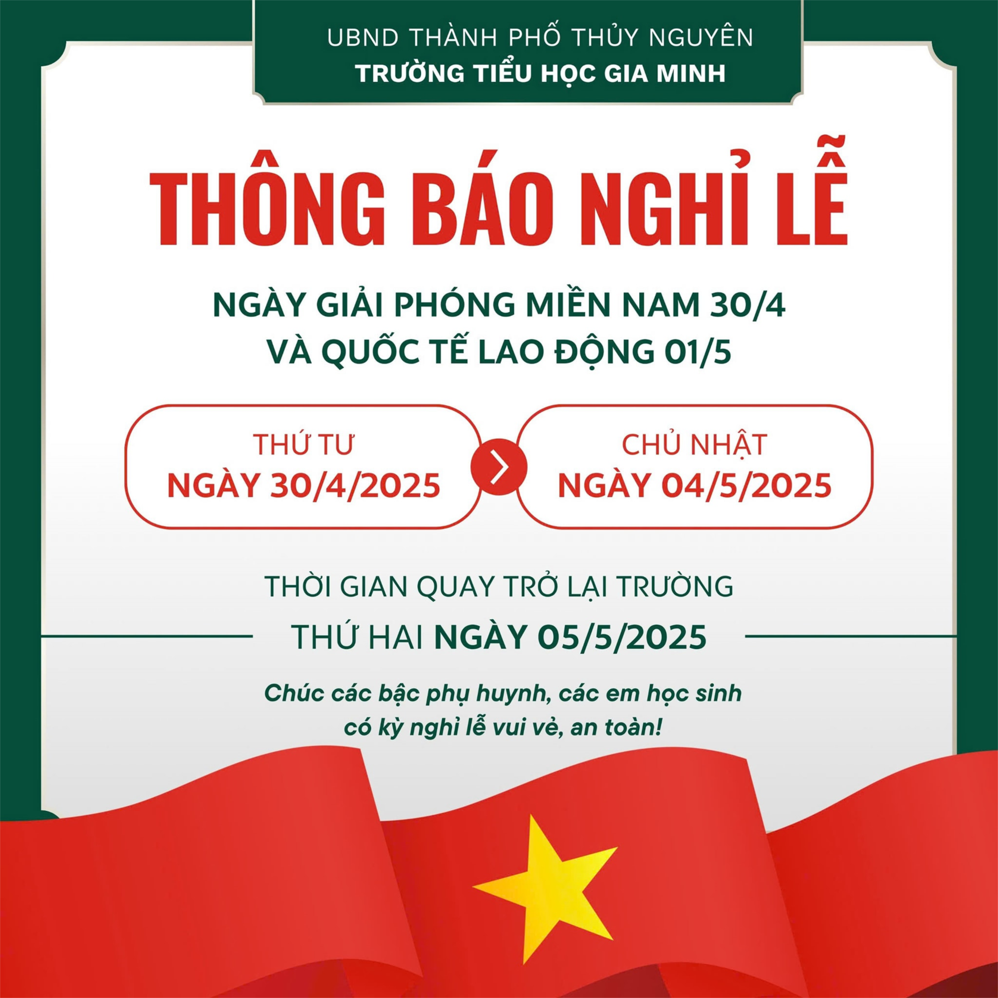 🇻🇳Hòa trong không khí trang trọng và thiêng liêng nhân dịp kỷ niệm 50 năm Ngày Giải phóng miền Nam, thống nhất đất nước (30/4/1975 – 30/4/2025) và Ngày Quốc tế Lao động (1/5), Trường TH Gia Minh xin thông báo đến quý Phụ huynh và học sinh lịch nghỉ lễ 30/4 và 1/5 như sau: