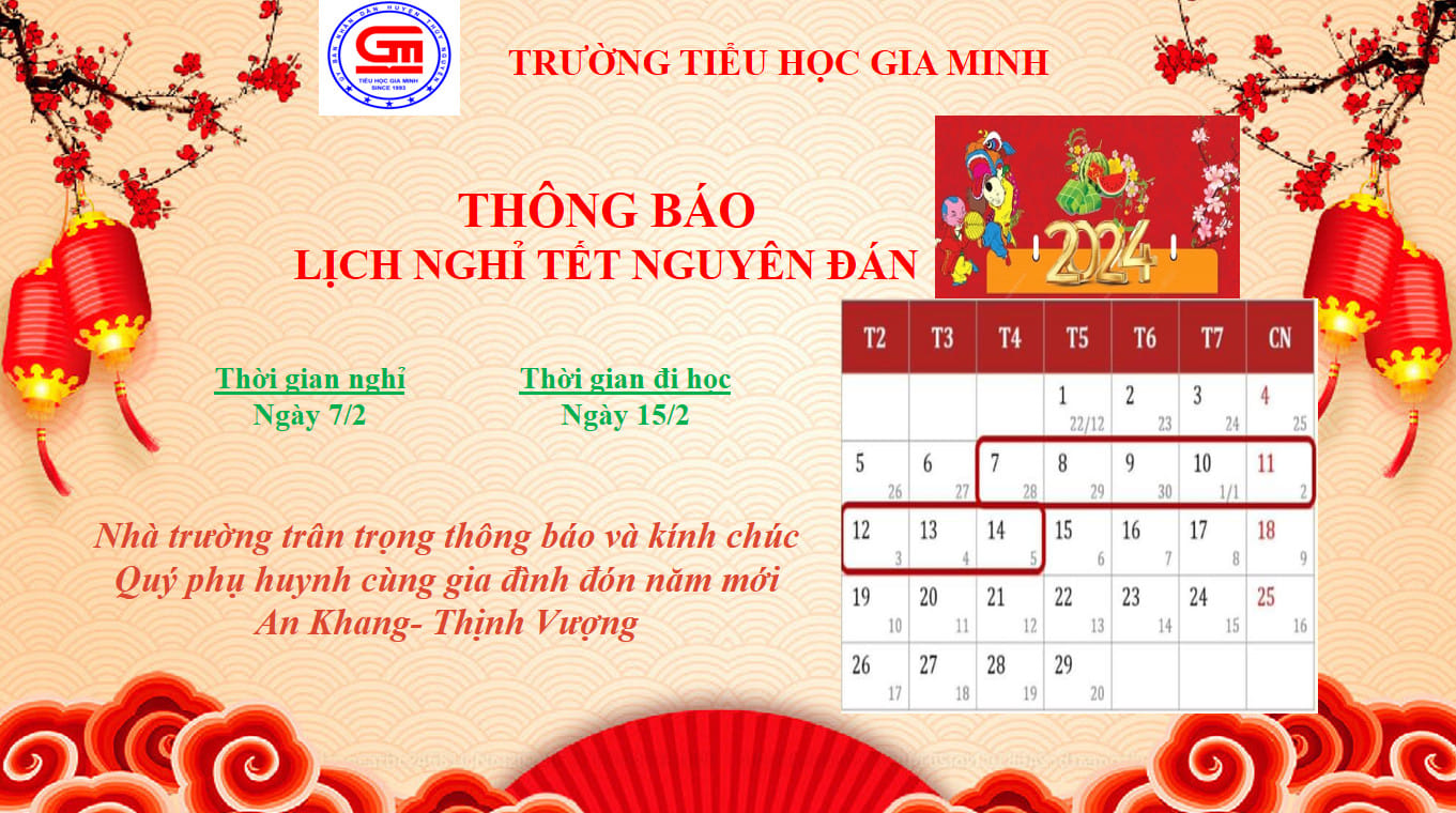 Căn cứ kế hoạch năm học và chương trình đào tạo năm học 2023 - 2024, trường Tiểu học Gia Minh xin trân trọng thông báo Lịch nghỉ Tết Nguyên đán Giáp Thìn - 2024, cụ thể như sau: