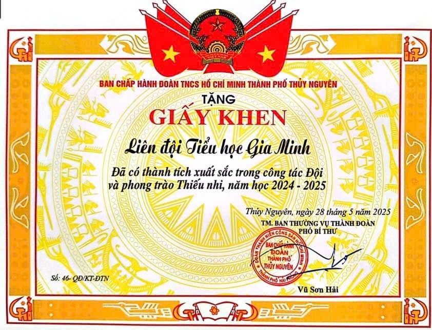 💫 Trong dịp này, Liên đội Trường Tiểu học Gia Minh vinh dự được trao tặng danh hiệu “Liên đội mạnh cấp thành phố” – ghi nhận những nỗ lực bền bỉ và sáng tạo trong việc triển khai, tổ chức các hoạt động Đội và phong trào thiếu nhi.