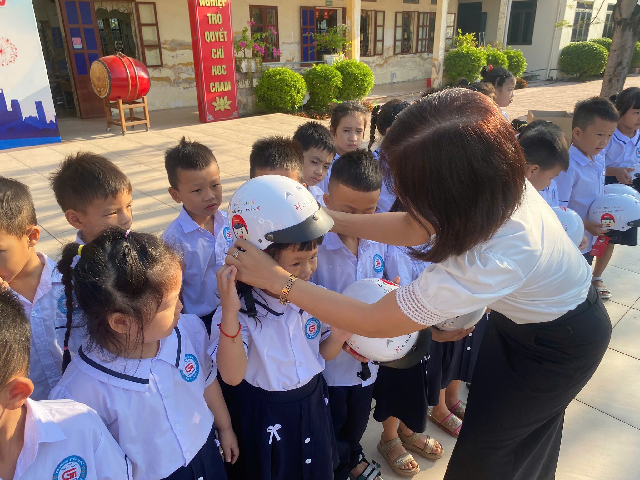 Buổi lễ diễn ra trong không khí vui tươi, hào hứng. Các em học sinh lớp 1 được nhận những chiếc mũ bảo hiểm xinh xắn, đạt chuẩn chất lượng, thể hiện sự quan tâm sâu sắc của công ty Honda và các cấp ngành đối với công tác giáo dục an toàn giao thông cho trẻ em ngay từ những ngày đầu đến trường.